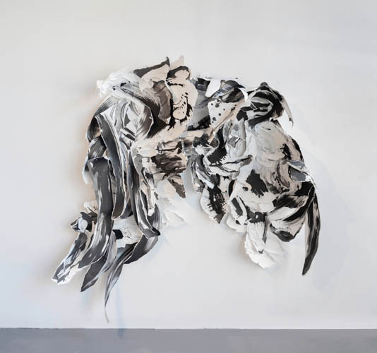 Katherine Nemanich. The Woods So Wild #2. 2017. Sumi Ink on cotton rag paper, PVA adhesive, grommets, 80 x 74 x 20 (approx.)