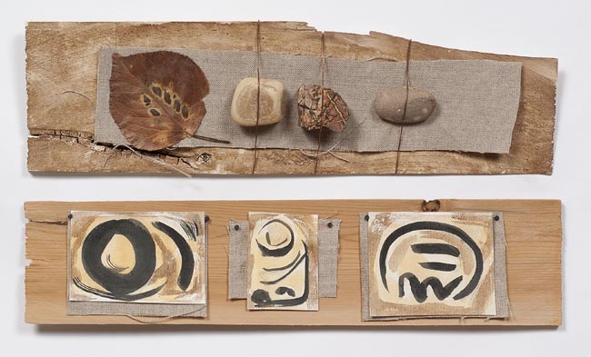 Katherine Nemanich, State of Mind, 2011. Rocks, copper wire, leaf, linen, canvas, ink, tacks on wood, 14 x 21 x 1 1/2 in.