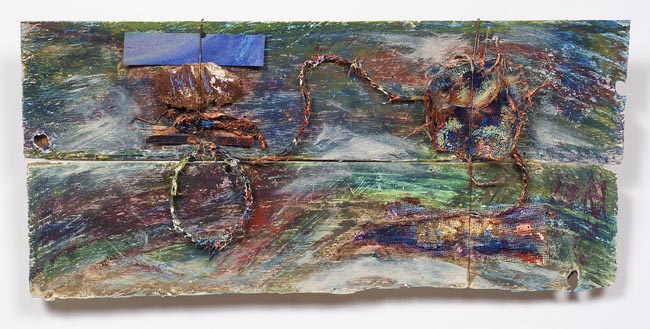 Katherine Nemanich, Flotsam, 2011. Oil pastel, paper, canvas, acrylic, bark, rope, copper wire, tacks on wood, 7 x 16 x 1 in.