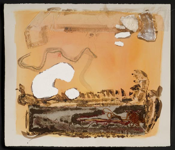 Katherine Nemanich, Little Bean, 2007. Walnut ink, watercolor, gouache, linen, collaged papers, acrylic, bookbinders cloth, rope, string on Rives BFK paper, 25 x 30 in.