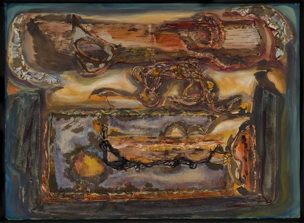 Katherine Nemanich, Metamorphosis, 2007. Ink, gouache, birch bark, watercolor, linen, thread, rice paper, bookbinders cloth, rope, brass, upholsterers cloth, string on Rives BFK paper, 22 x 30 in.